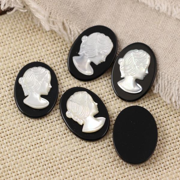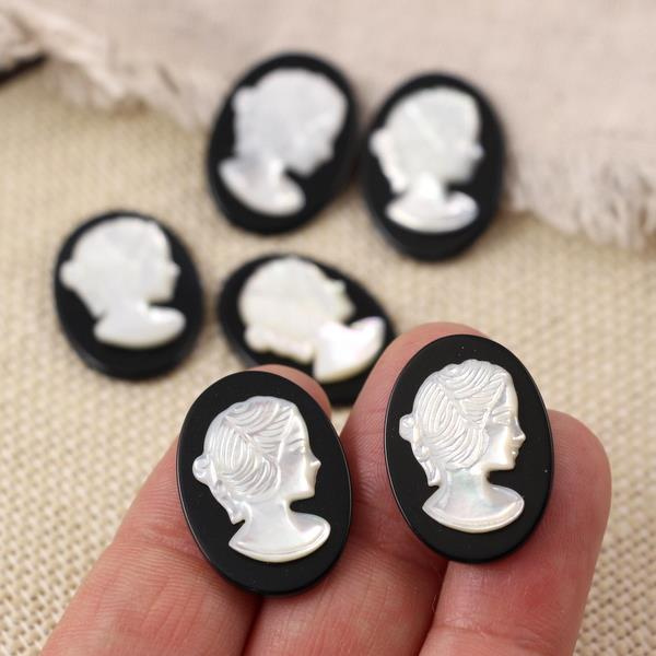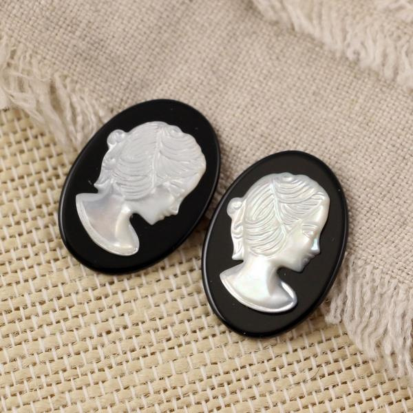 Kamea przestawia wizurek kobiety - damy. Kaboszony przeznaczone do oprawy jubilerskiej albo do zastosowania w sutaszu lub beadingu. Kaboszon od spodu płaski, bez otworu. Wielkość na kolczyki lub zawieszkę.