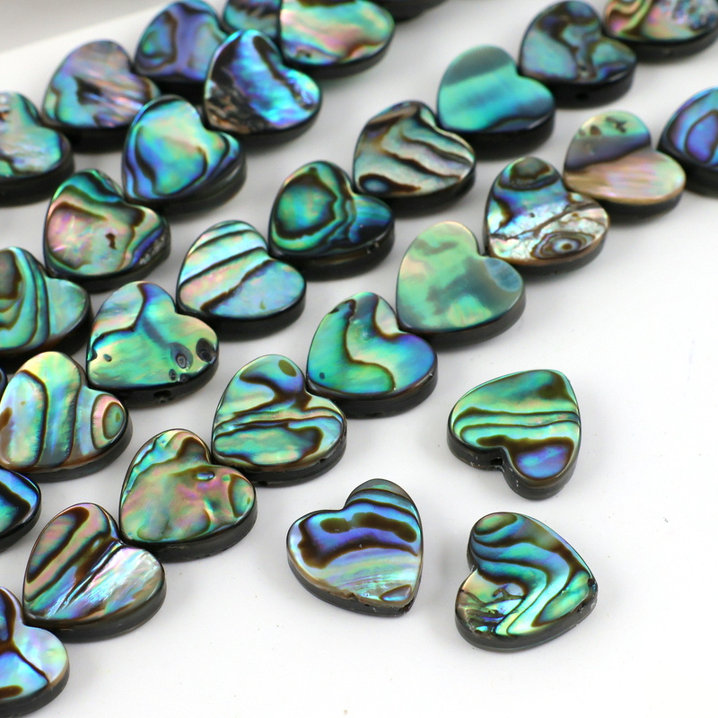 Muszle obustronnie z tęczowym połyskiem w kształcie serca. Każdy egzemplarz ma inny wzór, ale w miarę możliwości postaramy się wybierać podobne.
