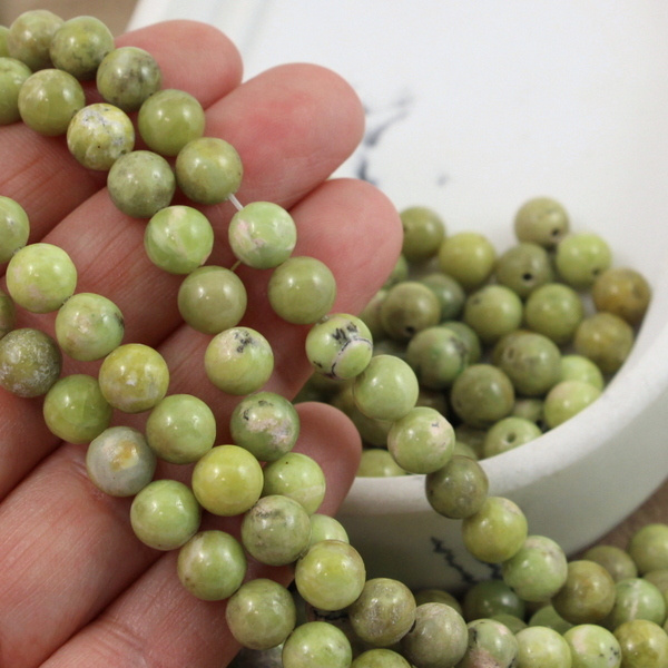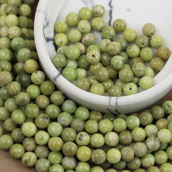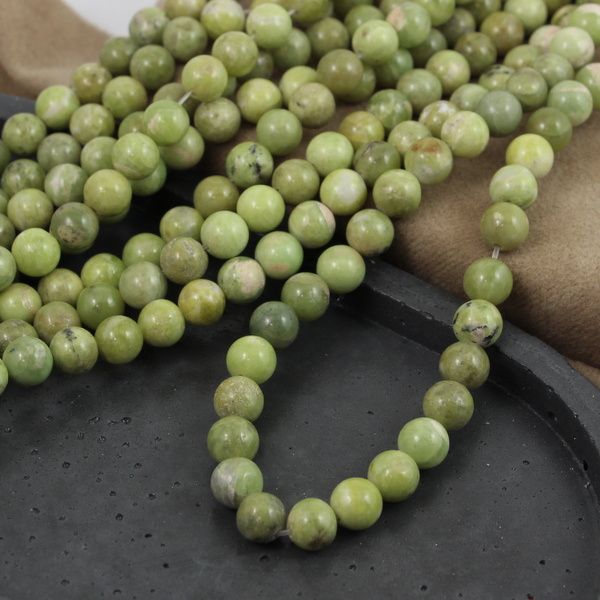 Gładkie kulki naturalnego oliwinu, zielone okraszone białymi pajączkami z kapką rdzawych plamek.