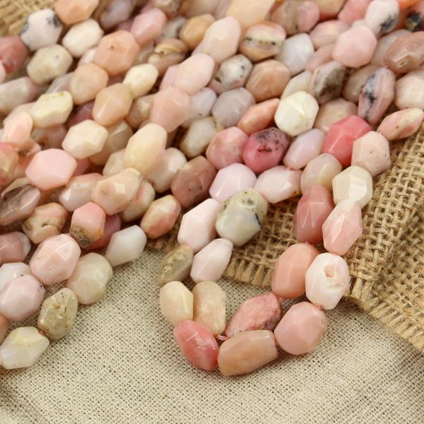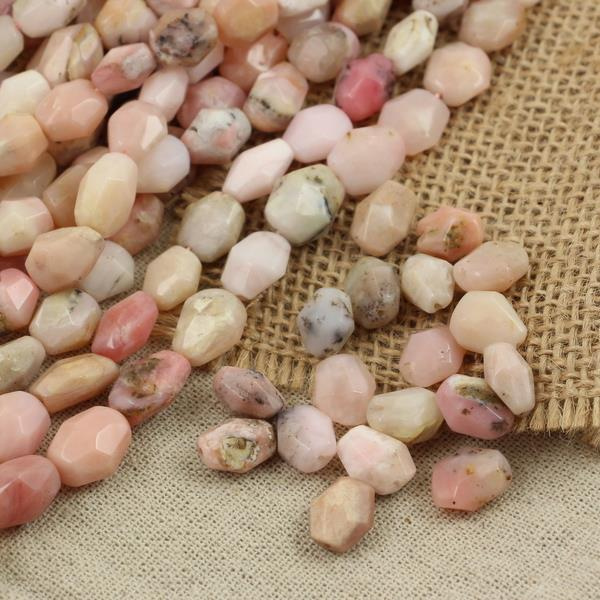 Fasetowane nieregularne bryłki różowego opalu peruwiańskiego. Duża nieregularność w szerokości i grubości. Rozmiar: 8-10 x 7-11mm