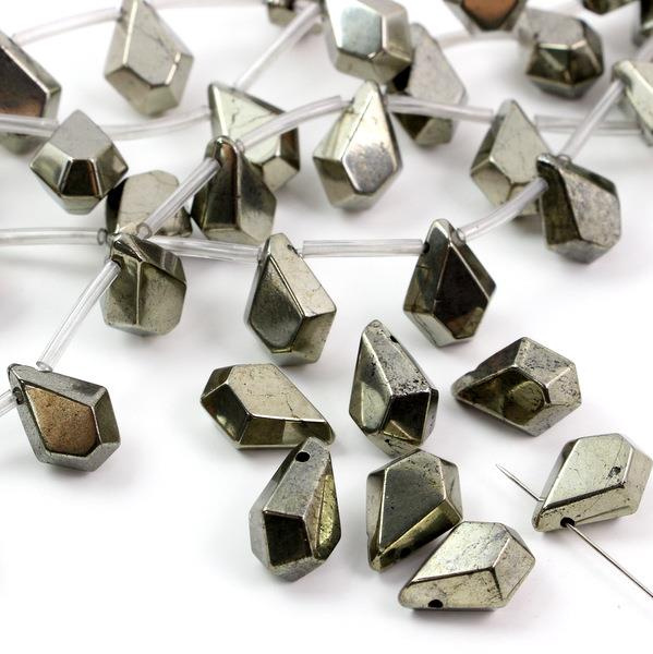 Piryt w kształcie wypukłej kropli, gruby, ciekawy szlif. Piryty ciekawie będą wyglądać jako zwieńczenie bogatych naszyjników, mogą być też wykorzystane jako element główny klasycznych kolczyków.