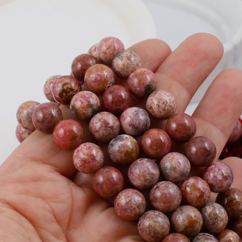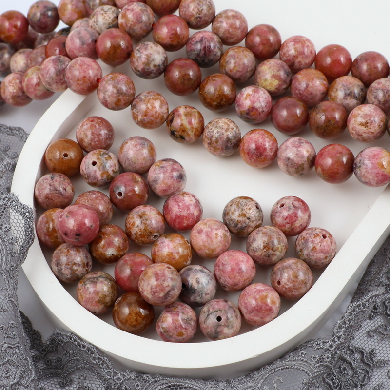 Kule gładkiego rodonitu brazylijskiego o ciepłej, naturalnej kolorystyce w odcieniach różu, malinowego, karmelowego i brązu, z delikatnymi przejściami barw i plamkami w tonacji szarości. Każdy koralik jest niepowtarzalny – tworzy harmonijną kompozycję barw natury.
