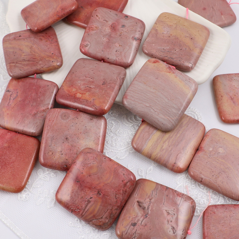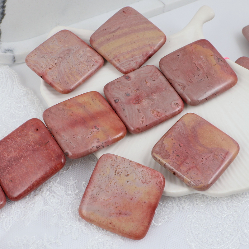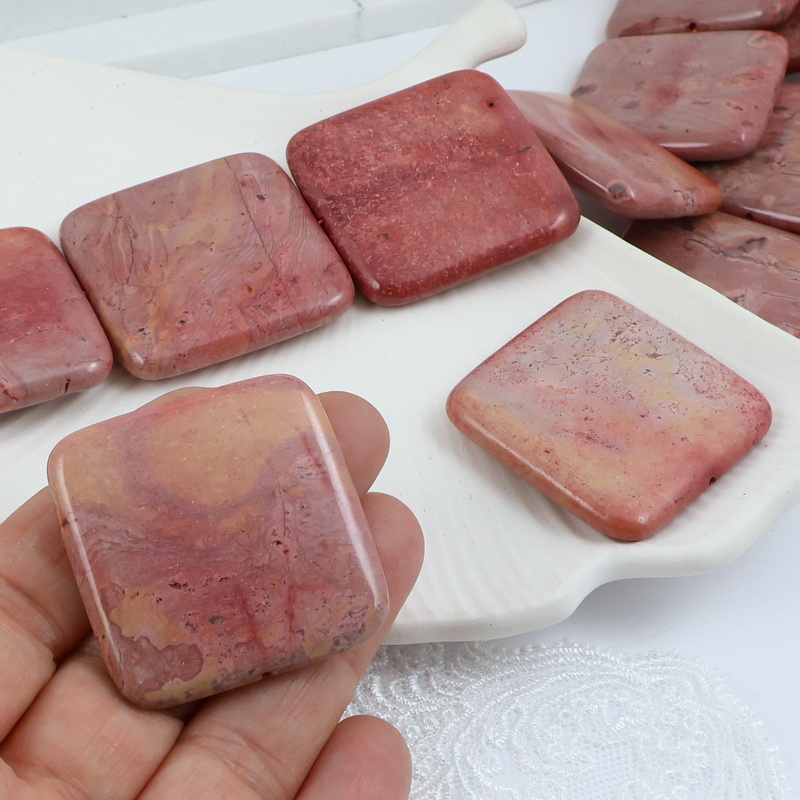 Każdy egzemplarz unikatowy. Wzory: naturalne smugi, żyłki i plamy w odcieniach różu, starej cegły, pudru i kakao. Czasem przypominają pociągnięcia pędzla, czasem spękaną ziemię - żadnych dwóch takich samych. Rodonit to kamień serca. Kolor naturalny.