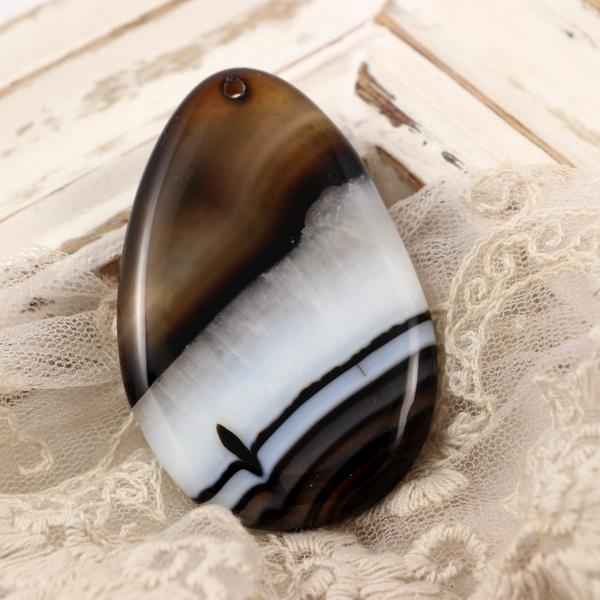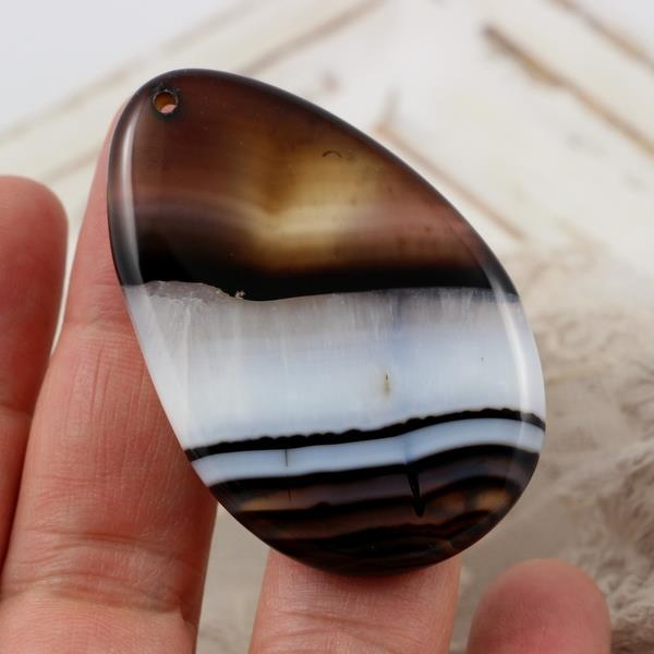 OpisPlaster, duża zawieszka z sardonyksu do zawieszenia na rzemyku, sznurku itp. Można obszyć sutaszem i koralikami. Kamień ma naturalny kolor (nie jest barwiony). Sardonyks to agat warstwowy posiadający pasma w kolorze czerwonym i białym. *Przedmiotem sprzedaży jest egzemplarz ze zdjęcia.*