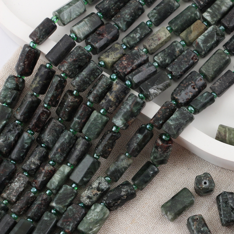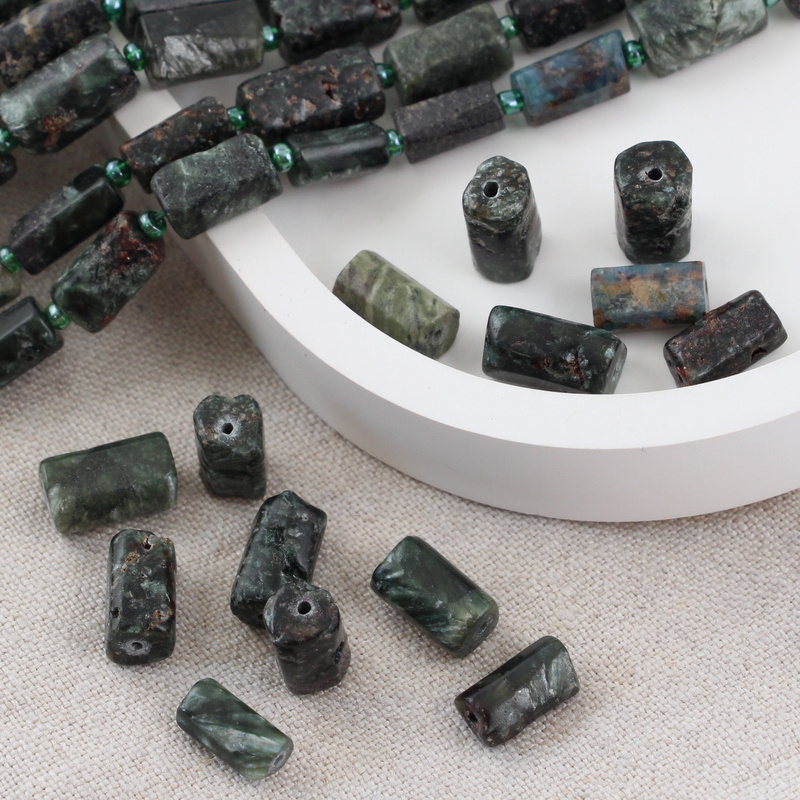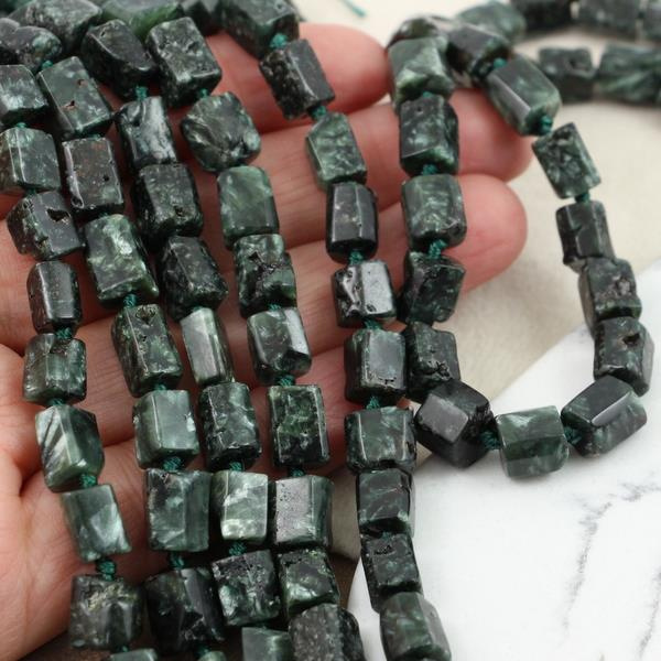 Nieregularne wałeczki / bryłki naturalnego serafinitu. To bardzo rzadki i cenny minerał w kolorze leśno-zielonym poprzecinany perłowo-srebrzystymi wstęgami.