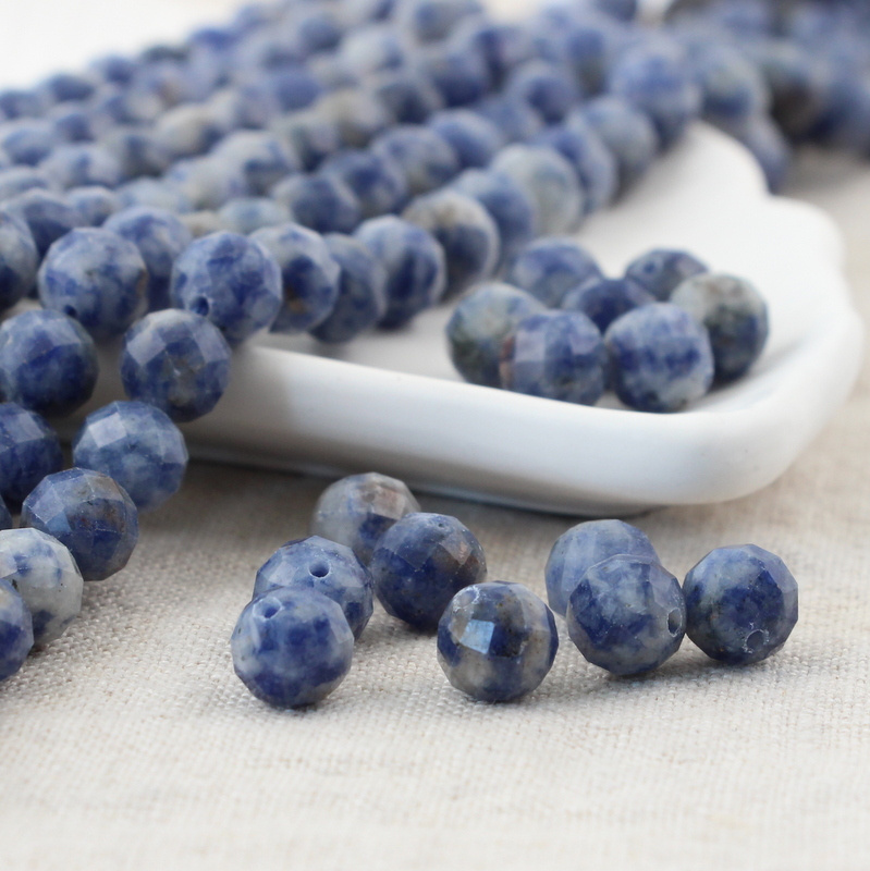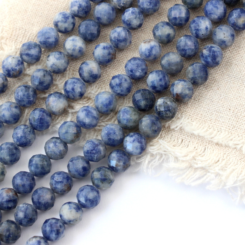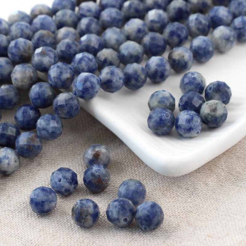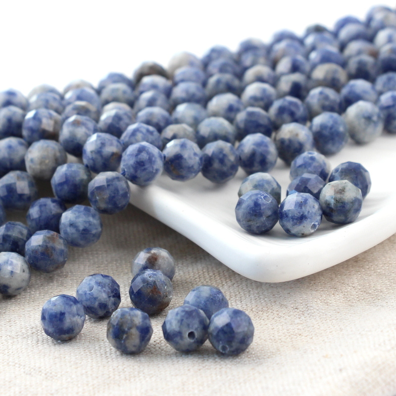 Naturalny sodalit, kule fasetowane niebiesko-granatowe z białym i rdzawymi wtrąceniami.