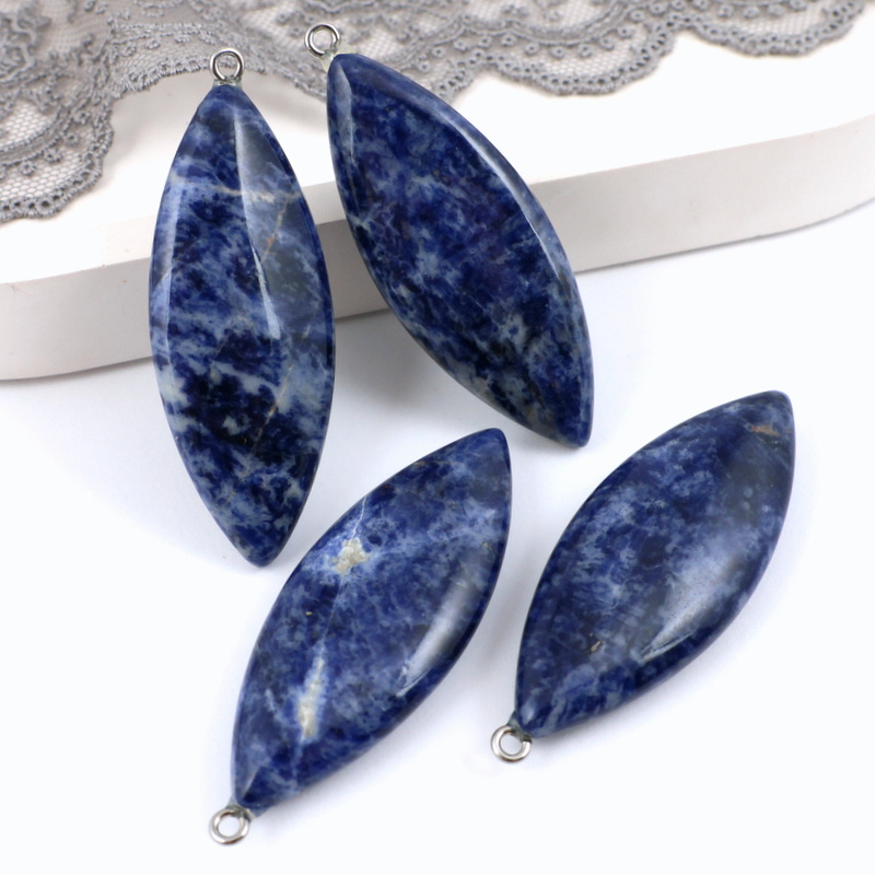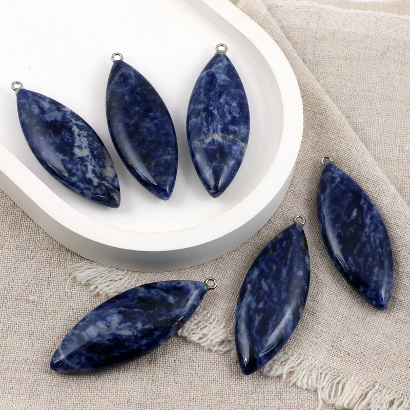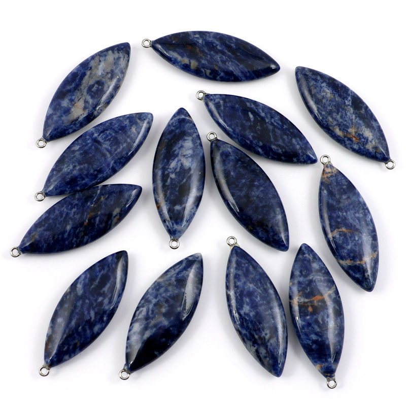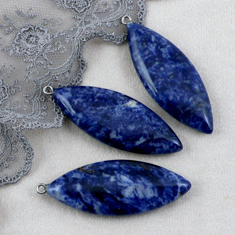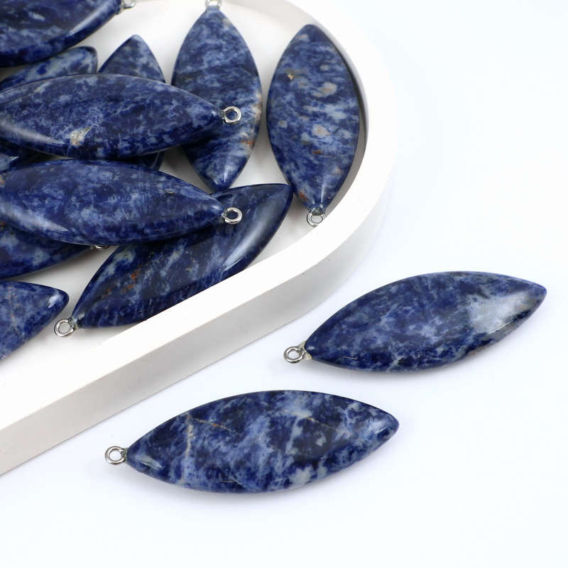 Zawieszka naturalnego sodalitu w kształcie wrzeciona z metalowym uszkiem pozwalającym na przewleczenie łańcuszka, rzemienia itp. Obustronnie polerowana.