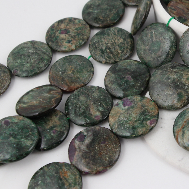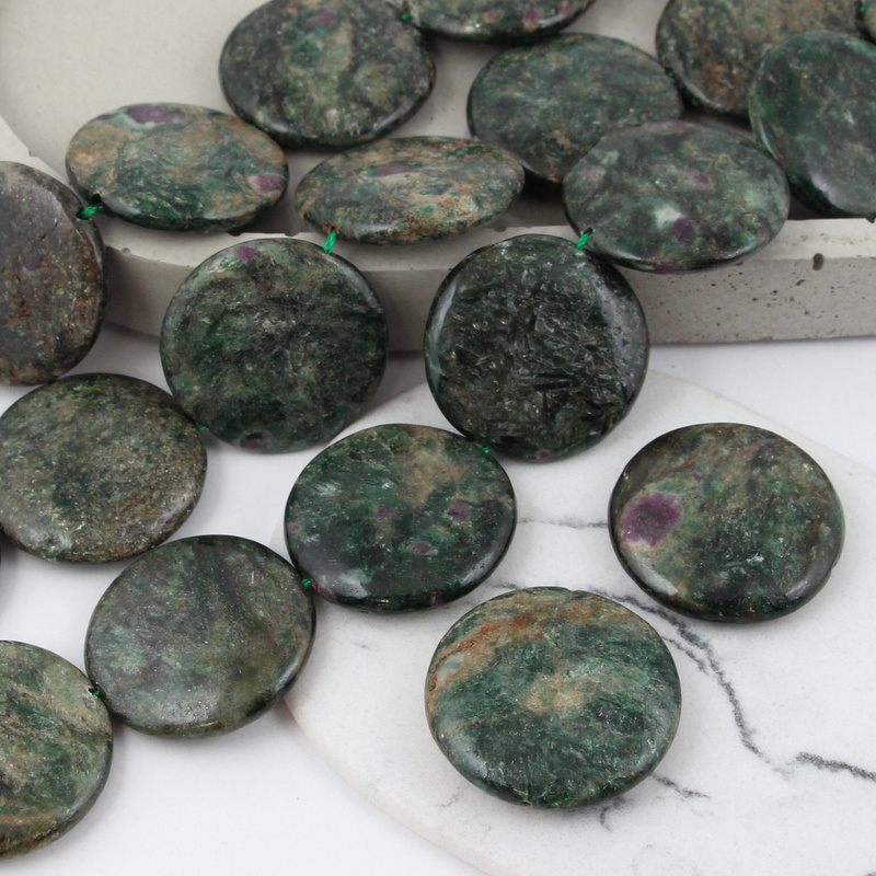 Gładkie, duże monety naturalnego szmaragdu. Część kamieni ukazuje w sobie wtrącenia rubinu, w dużej części kamieni są liczne domieszki minerałów w odcieniach szarosci, czerni, brązu. Kamienie w większości ciemnozielone, pozostałe to brązy i zieleń z rubinem. Każdy kamień jest inny.