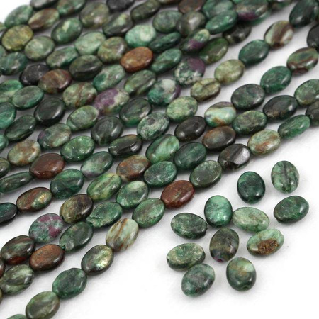 Gładkie, niewielkie owale naturalnego szmaragdu. Część kamieni ukazuje w sobie wtrącenia rubinu. Kamienie w większości ciemnozielone, pozostałe to brązy, krem i zieleń z rubinem. Niewielkie nierówności na powierzchni.