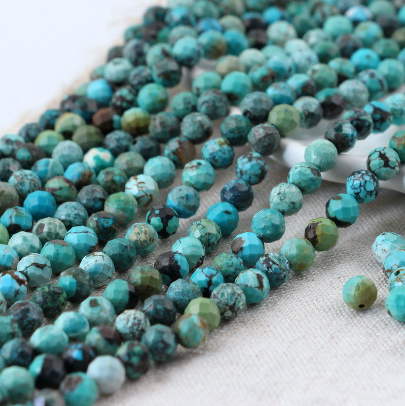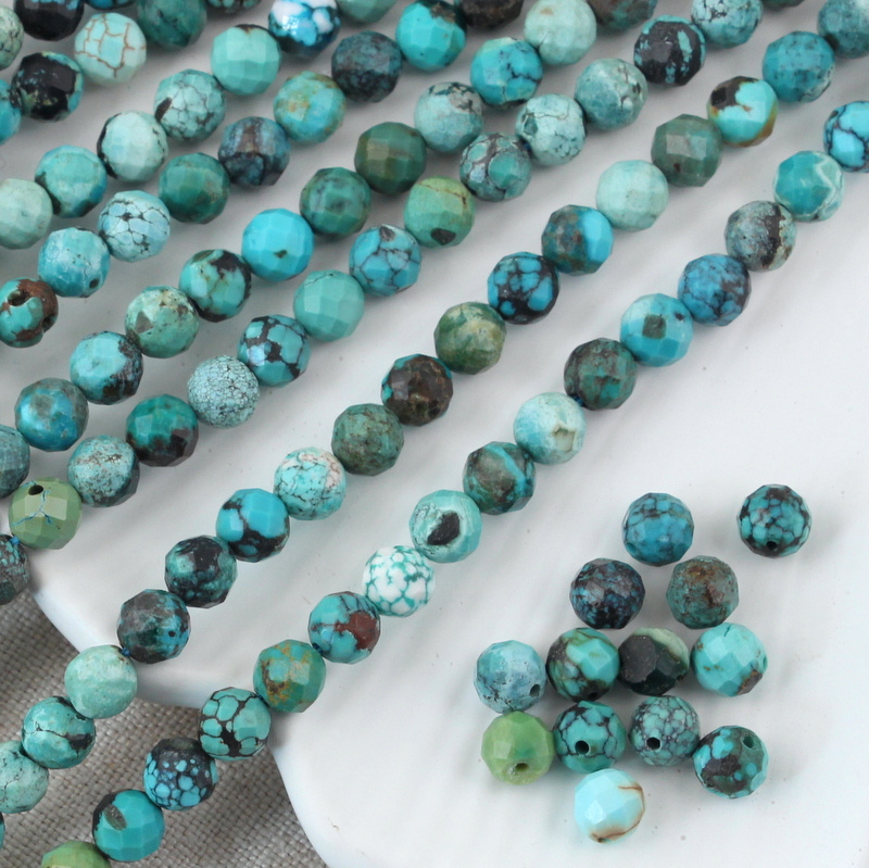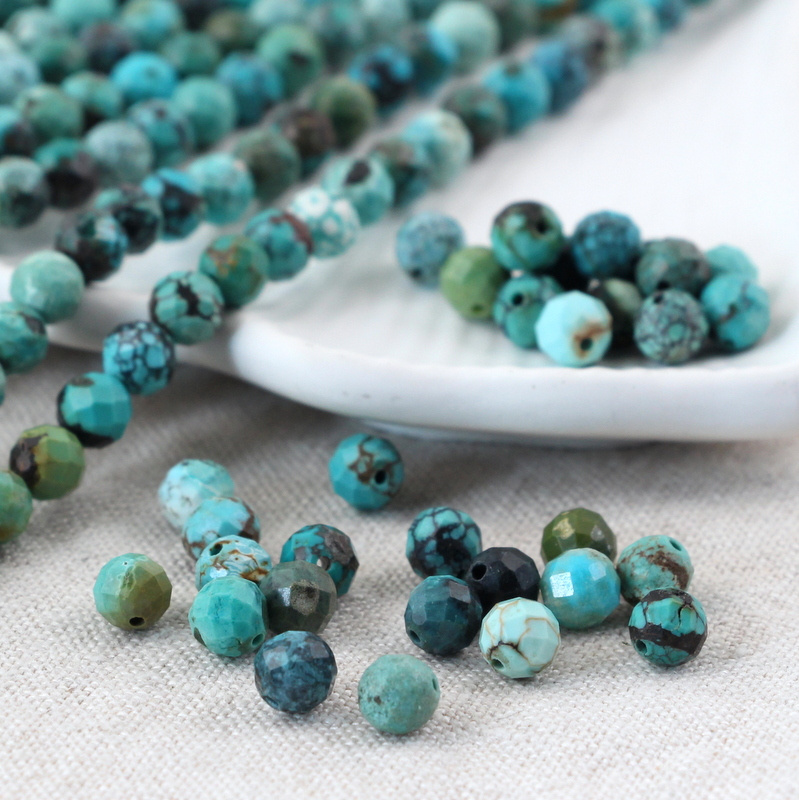 Drobno fasetowane kule naturalnego turkusu w kolorystyce zielono-niebiesko-brązowej.