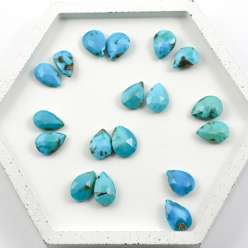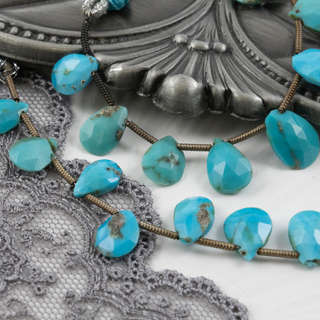 Turkus naturalny w formie fasetowanych łezek. Kamienie staraliśmy się dobrać w pary tak, aby były do siebie możliwie najbardziej zbliżone rozmiarem i kolorem.