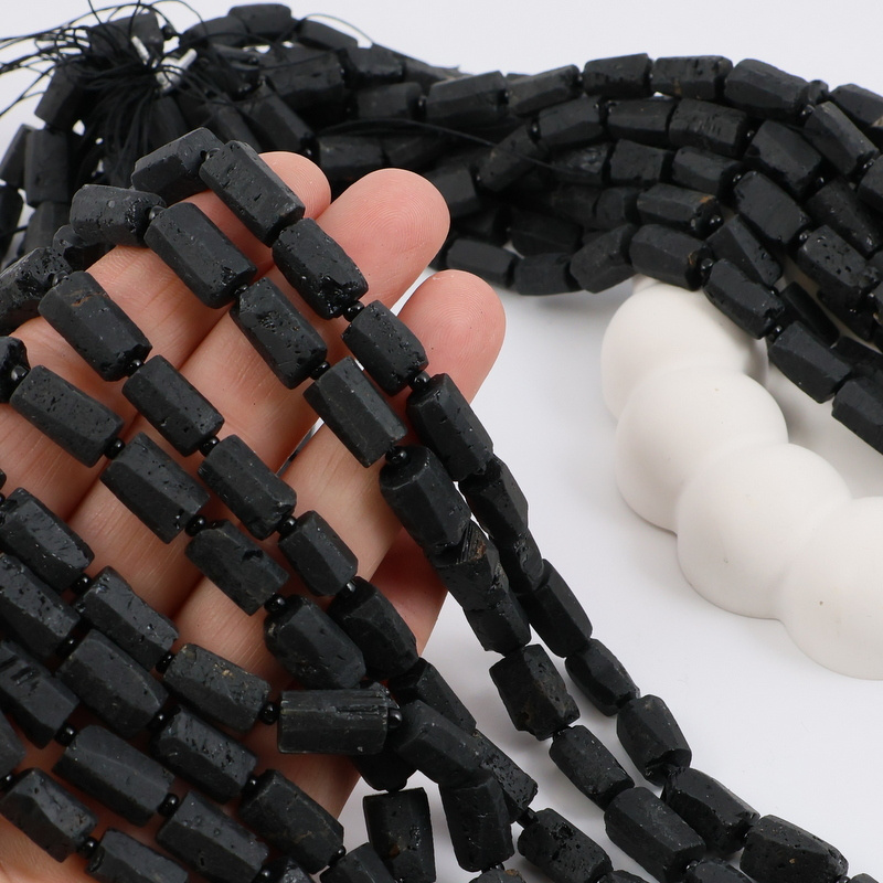 Czarny turmalin w postaci podłużnych kamieni zbliżonych kształtem do walca.