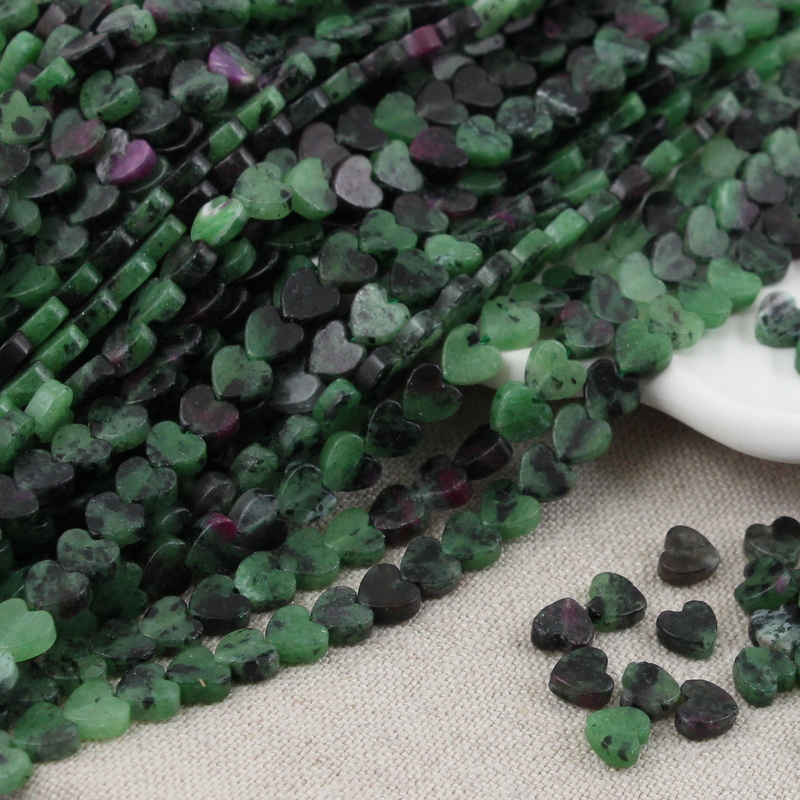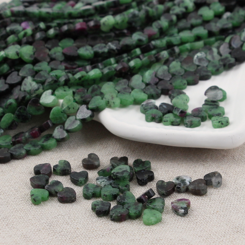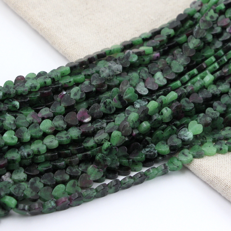 Drobne, gładkie serduszka zoizytu z rubinem. Butelkowa zieleń z dodatkiem czarnych wtrąceń i rubinu.