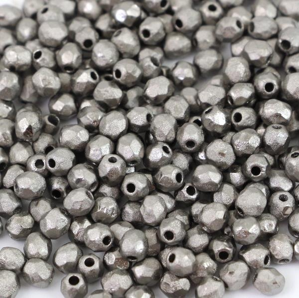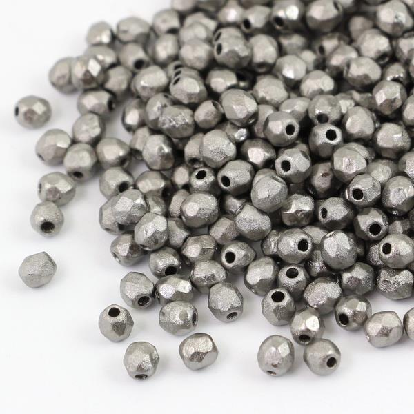 OpisSzlifowane koraliki szklane produkowane w Czechach, jasnografitowe, trawione.