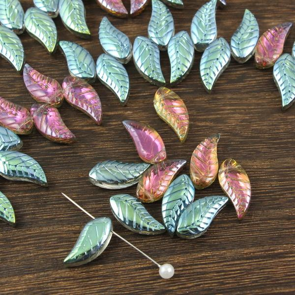 OpisSzklane listki, znakomite do wszelkich projektów i wykończeń. Listki z jednej strony metaliczno zielone z drugiej różowo-tęczowe. W paczce wybór losowy listków prawych i lewych.