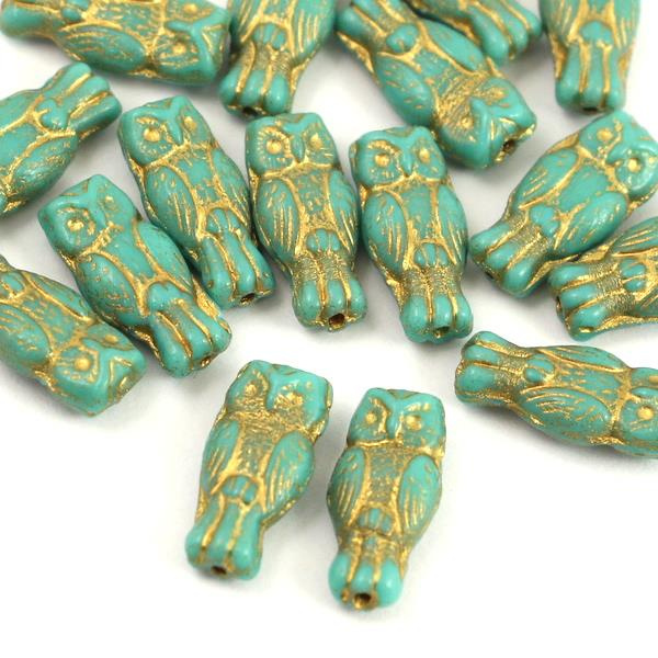 Owl Beads Opaque Turquoise Green Gold 15x7mm