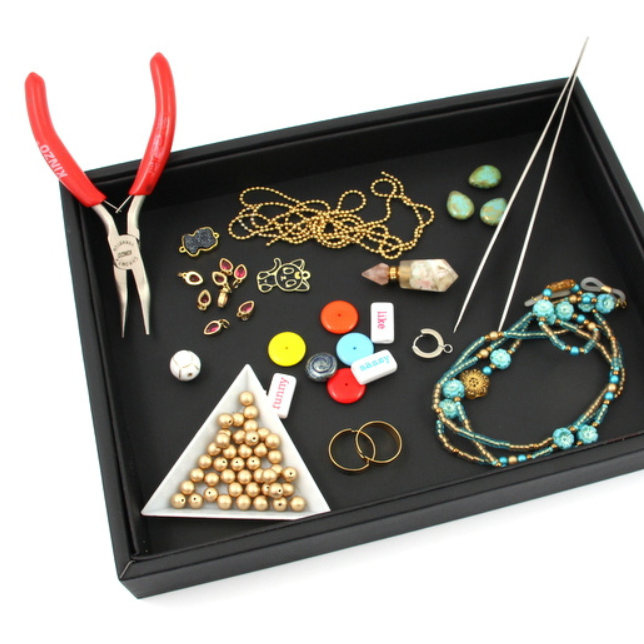 Czarna, głęboka taca do pracy z koralikami, wykonana z tworzywa sztucznego, lekka i poręczna.