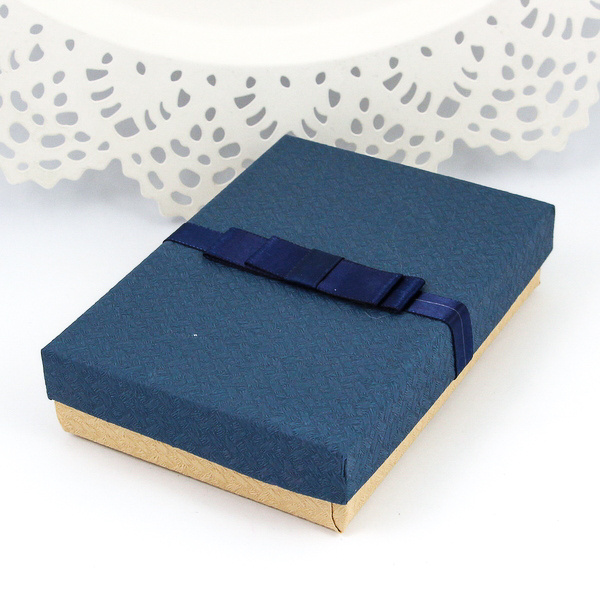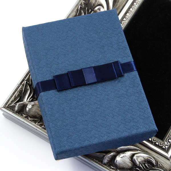 Seria pudełek na biżuterię z płaską kokardką, powierzchnia w jodełkę, tektura matowa. W środku czarny wkład z nacięciami na kolczyki, wisior lub pierścionek.