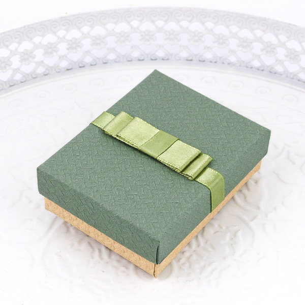 Seria pudełek na biżuterię z płaską kokardką, powierzchnia w jodełkę, tektura matowa. W środku czarny wkład z nacięciami na kolczyki, wisior lub pierścionek.