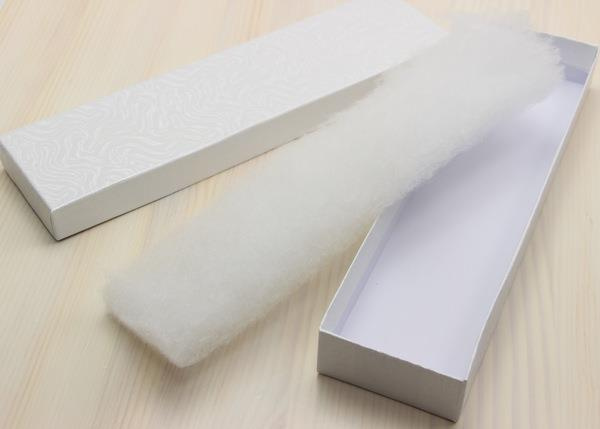 OpisPudełko tekturowe na biżuterię z ciekawą fakturą; w środku wypełnione jest bawełnianym puchem. Proste, bez ozdób, dla pięknej biżuterii, której dopełnieniem ma być pudełko, a nie odwrotnie :-)