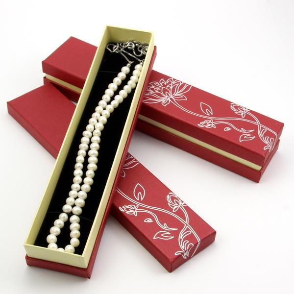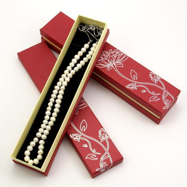OpisTekturowe pudełko prezentowe przeznaczone na niewielkie naszyjniki lub bransolety. W takim pudełku ładnie prezentują się perły.