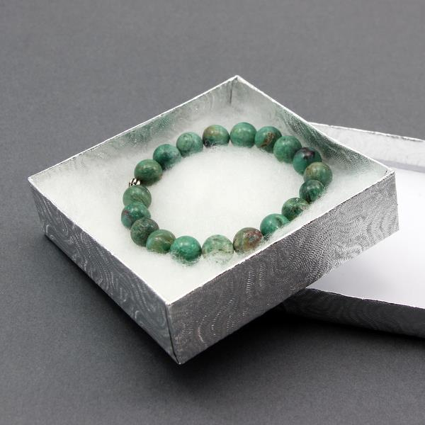 OpisPudełko tekturowe na biżuterię z ciekawej fakturze; w środku wypełnione jest bawełnianym puchem. Proste, bez ozdób, dla pięknej biżuterii, której dopełnieniem ma być takie pudełko, a nie odwrotnie :-)