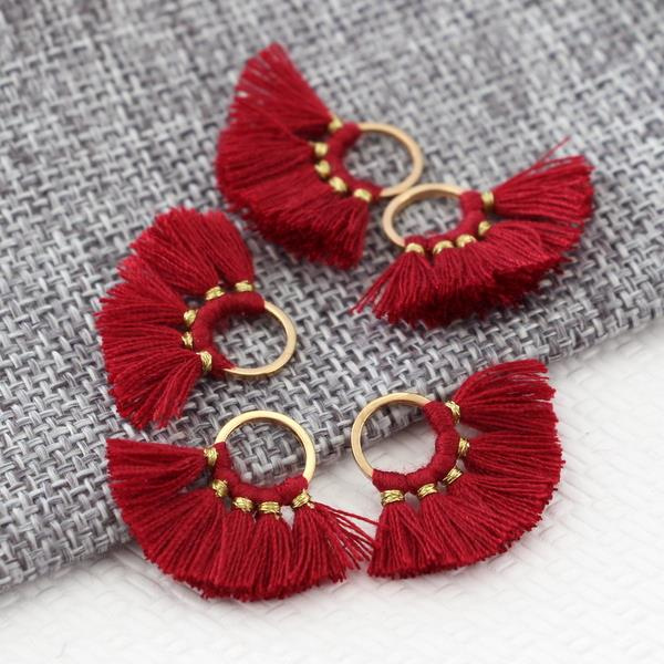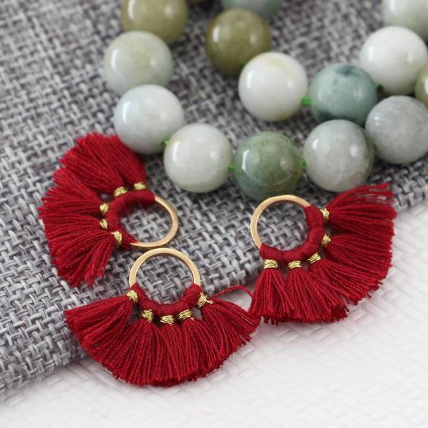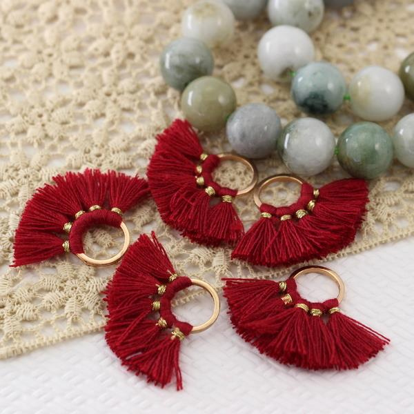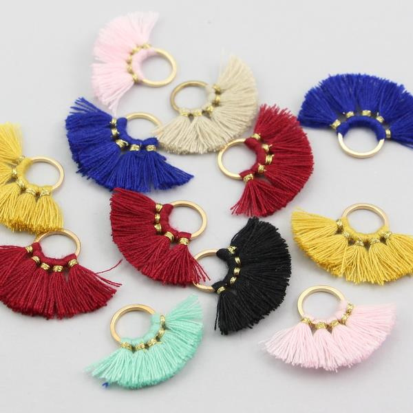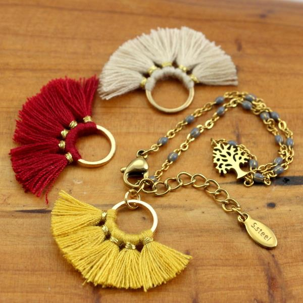 OpisChwosty z nici na kółku w kolorze złotym. Chwosty układają się w szeroki wachlarz. Po zamocowaniu bigla lub krawatki element staje się efektownym kolczykiem lub zawieszką. Polecamy do projektów w stylu etno lub boho.