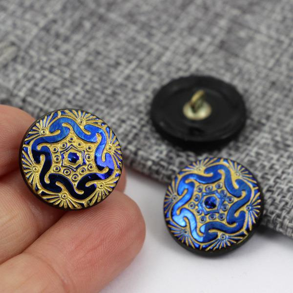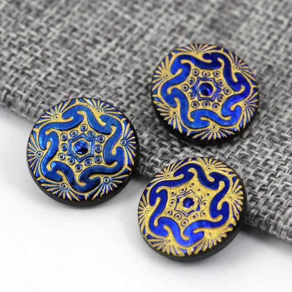 OpisRęcznie zdobione, szklane guziki z mosiężną stopką. Dzięki swym oryginalnym zdobieniom idealnie nadają się do biżuterii. Są częstym elementem w biżuterii sutaszowej, beadingowej, można je również z powodzeniem wykorzystywać do odzieży. Niektóre guziki zdobione są prawdziwym złotem, platyną, a proces ich tworzenia jest niezwykle pracochłonny.