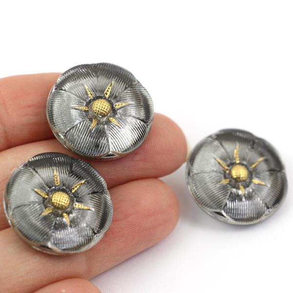 OpisRęcznie zdobione, szklane guziki z mosiężną stopką. Dzięki swym oryginalnym zdobieniom idealnie nadają się do biżuterii. Są częstym elementem w biżuterii sutaszowej, beadingowej, można je również z powodzeniem wykorzystywać do odzieży. Niektóre guziki zdobione są prawdziwym złotem, platyną, a proces ich tworzenia jest niezwykle pracochłonny.