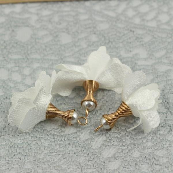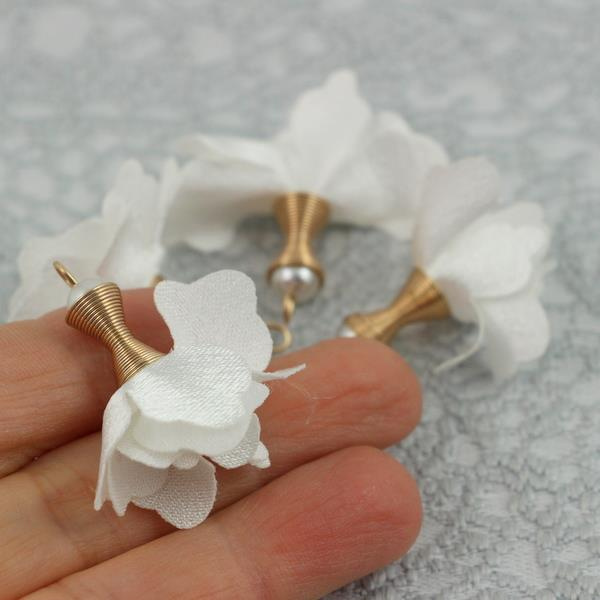 Średniej wielkości kwiatuszki z tulejką i lupikiem. Kwiatki wykonane z tkaniny ujęte w wysoką wąską, tulejkę, zakończone białą perełką. Wystarczy zamontować najprostsze bigle, i kwiatki zmieniają się w kolczyki. Kwiatki - zawieszki można używać także do ozdabiania projektów z sutaszu czy haftu koralikowego.
