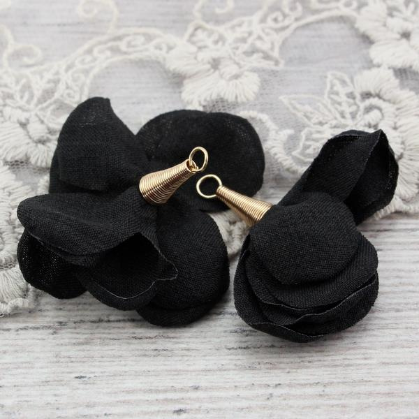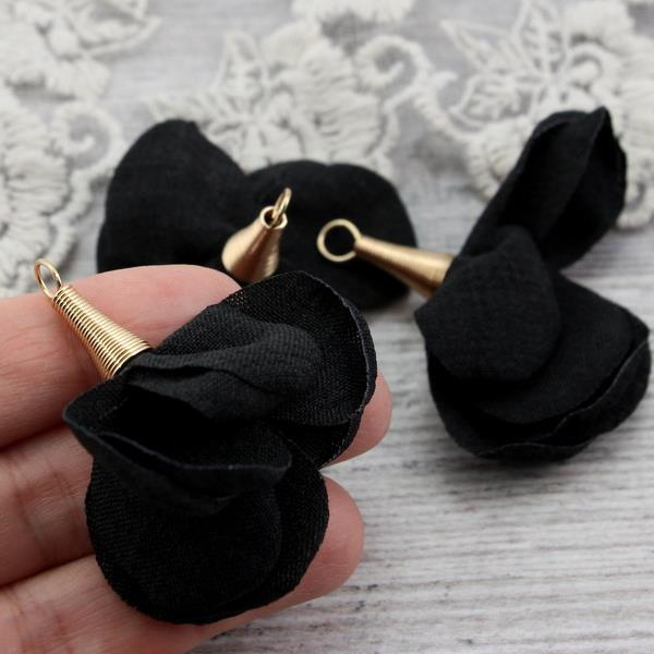 Ozdobne, delikatne kwiatuszki z tulejką i lupikiem. Kwiatki wykonane z tkaniny, wielowarstwowe, ujęte w wysoką wąską, stożkową tulejkę. Kwiatków można używać do ozdoby naszyjników. Wystarczy zamontować najprostsze bigle i kwiatki zmieniają się w wesołe kolczyki. Kwiatki - zawieszki można używać także do ozdabiania projektów z sutaszu czy haftu koralikowego.