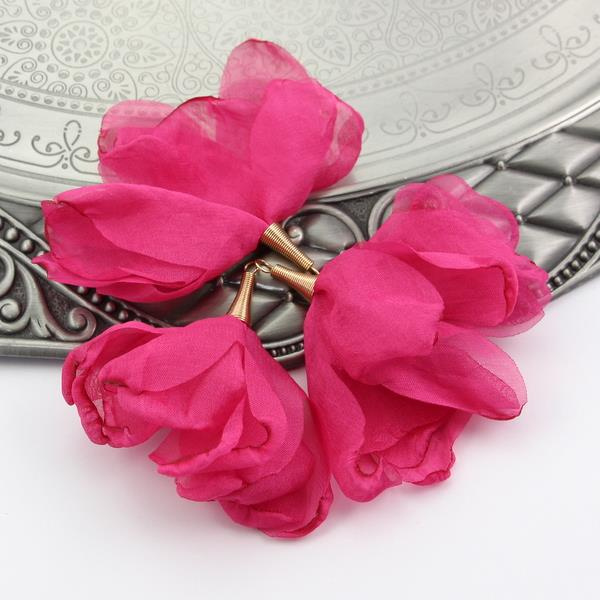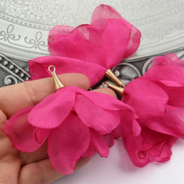 Szyfonowe, delikatne kwiatuszki z tulejką i lupikiem. Kwiatki wykonane z tkaniny, wielowarstwowe, ujęte w wysoką wąską, stożkową tulejkę. Tkanina, z której wykonano kwiatki, jest bardzo delikatna, zwiewna jak jedwab, doskonale imituje naturalne kwiatki. Kwiatków można używać do ozdoby naszyjników. Wystarczy zamontować najprostsze bigle i kwiatki zmieniają się w eteryczne, dziewczęce kolczyki lekkie niczym obłoczek. Kwiatki - zawieszki można używać także do ozdabiania projektów z sutaszu czy haftu koralikowego.