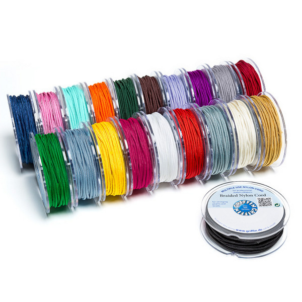 Wysokiej jakości pleciony sznurek nylonowy niemieckiej firmy Griffin. Sznurek wykonany jest z wysokojakościowych włókien nylonu o obniżonej rozciągliwości i podatności na odkształcenia. Wykonane z niego prace zyskują delikatną fakturę. Sznurek jest idealny do plecenia mikromakramy i bransoletek na sznureczku np. z zawieszką lub drobnymi kamieniami. Sznurek mimo swojej podwyższonej trwałości zachowuje miękkość i delikatność. Sznurek do makramy Griffin ma lekki satynowy połysk wydobywający urodę tworzonej z niego biżuterii, jest topliwy - końcówki można przytapiać, dzięki czemu nie strzepią się i wyglądają zawsze estetycznie.