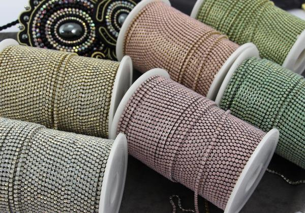 Szklane kryształki cyrkoniowe oprawione w metalową taśmę w kolorze złotym.
