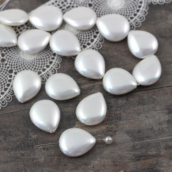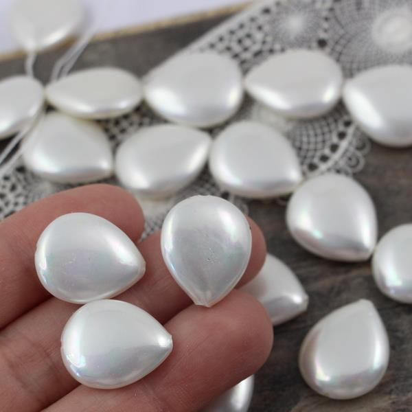 Jasne biało-kremowe łezki perły seashell z tęczową poświatą. Polecamy na projekty ślubne i komunijne. Otwór wzdłuż.