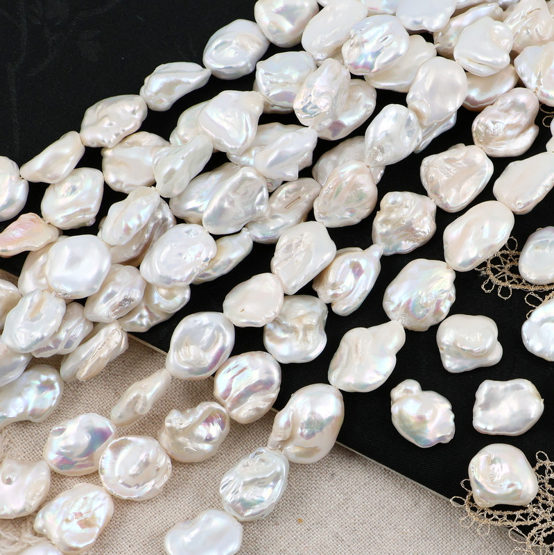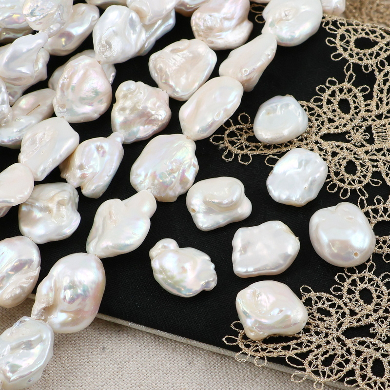 Nieregularne okazy perły barokowej. Kolor biały, kremowy z metaliczną poświatą.