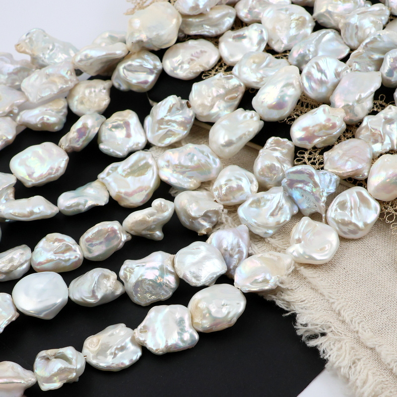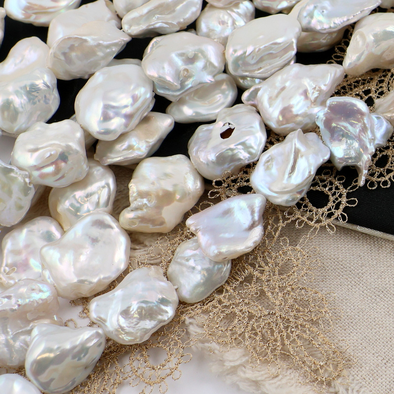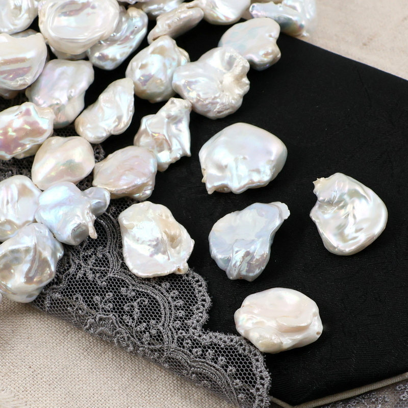 Nieregularne okazy perły barokowej. Kolor biały, kremowy z metaliczną poświatą.