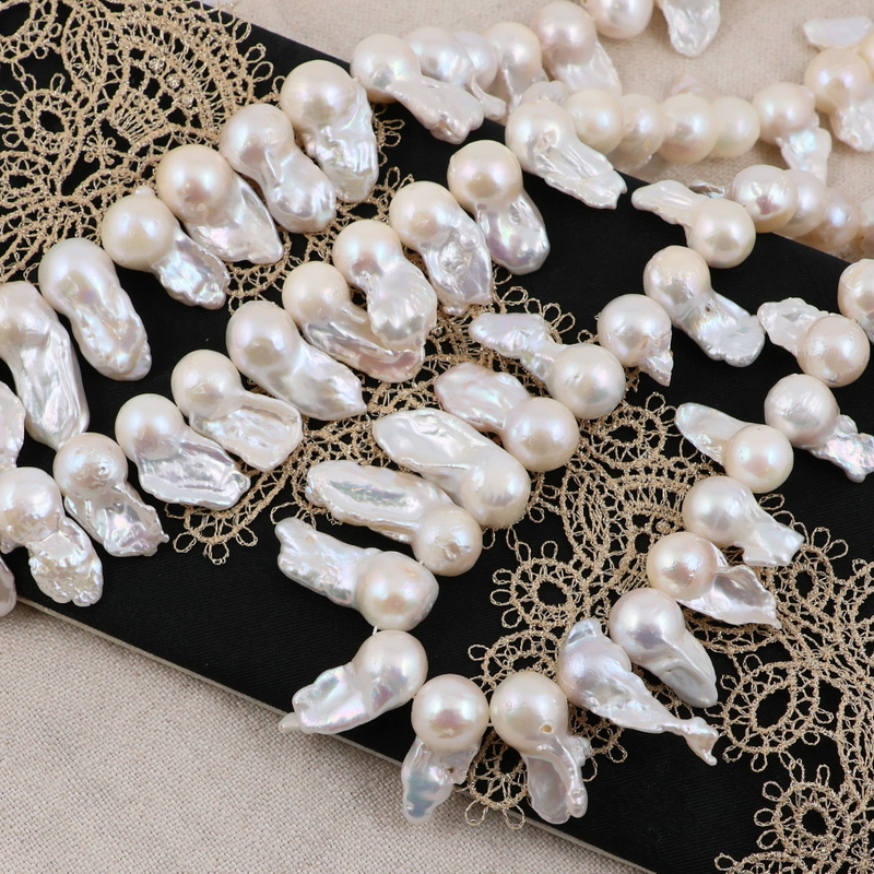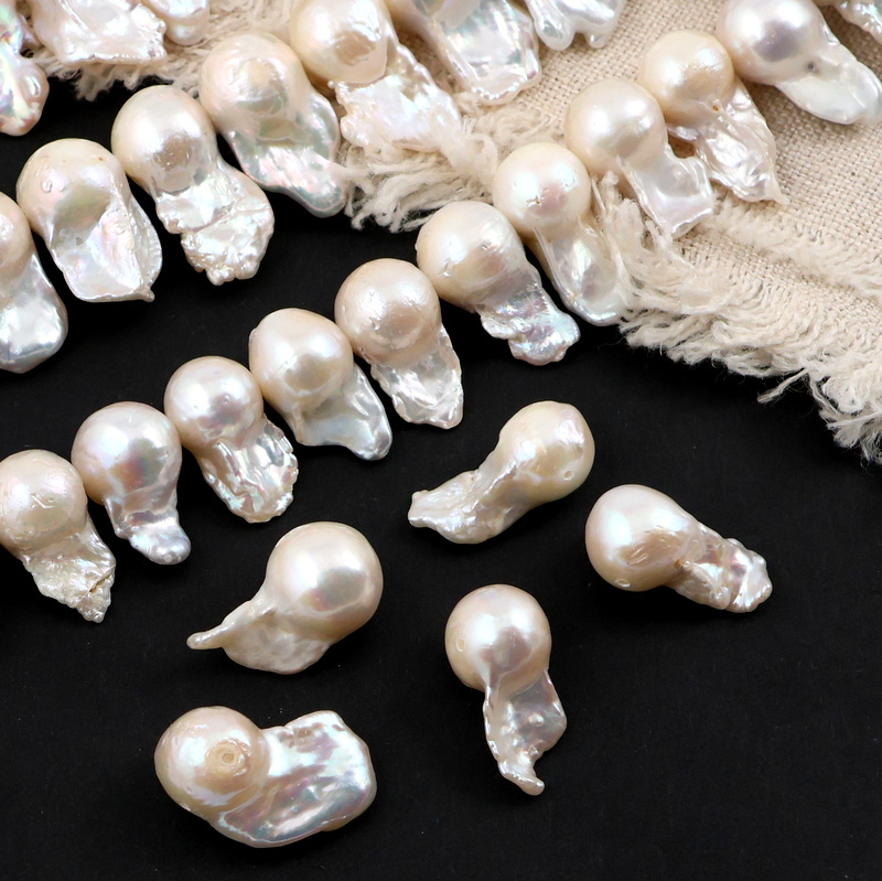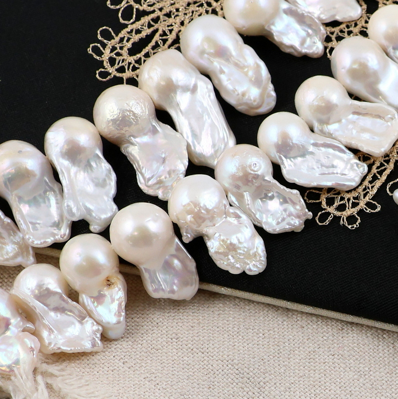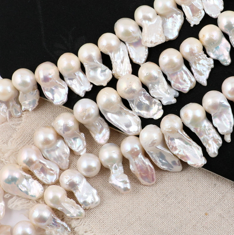 Nieregularne okazy perły barokowej. Kolor biały, kremowy z metaliczną poświatą.