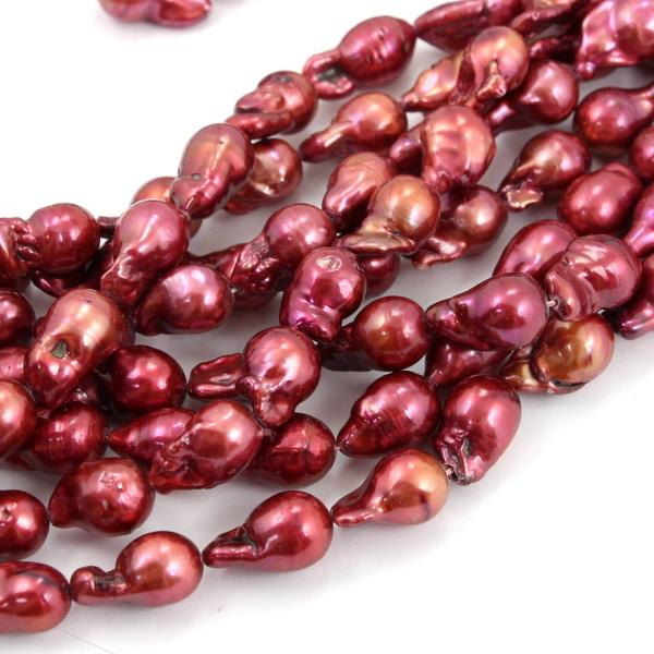 OpisNieregularny okazy perły barokowej. Mocny kolor różowy, rożne kształty, niektóre zbliżone do kropli inne bardziej okrągłe, na powierzchni nierówności, plamki innych kolorów.