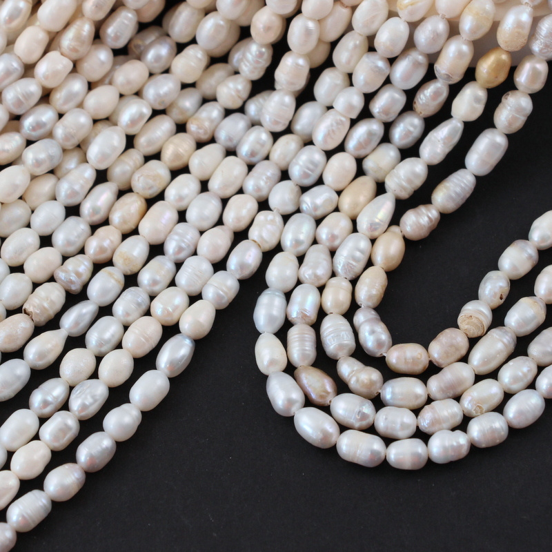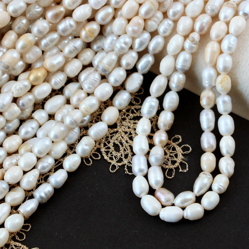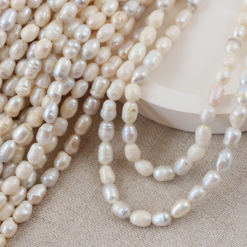 Naturalna perła słodkowodna w kształcie nieregularnej oliwki, o barwach przechodzących od ciepłego beżu przez klasyczną biel po subtelny, złotawy i srebrny połysk.