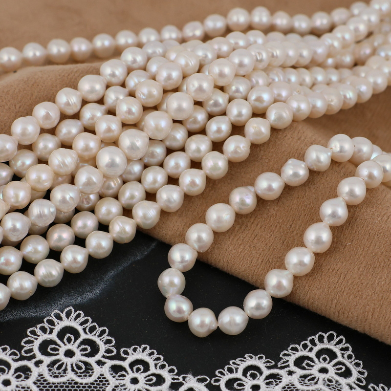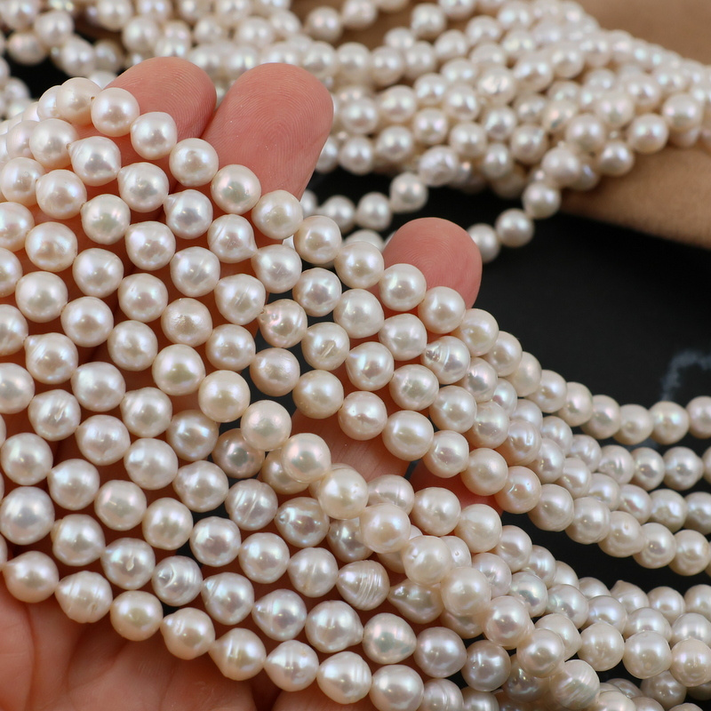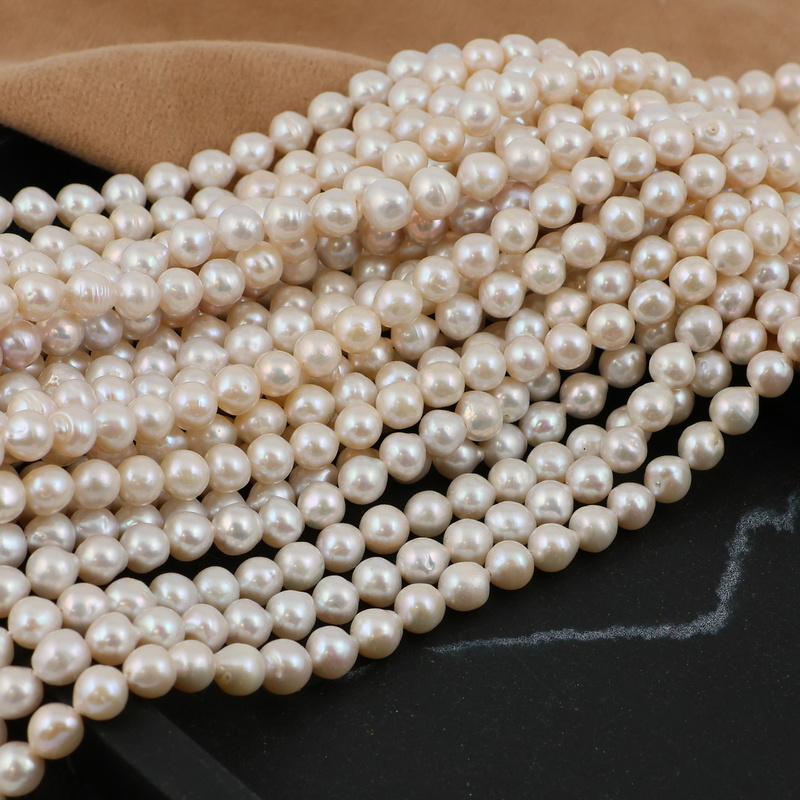 Perły słodkowodne w kształcie kul. Kolorystyka biel/ecru/lekki beż.