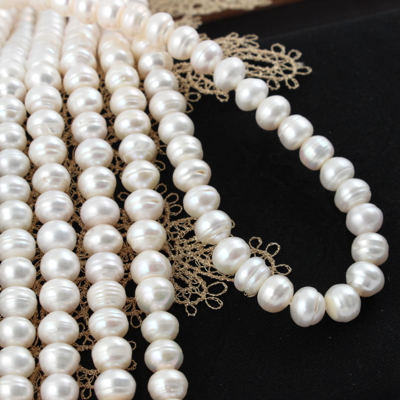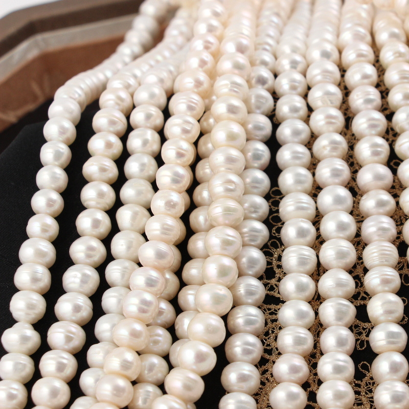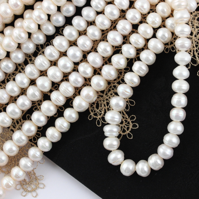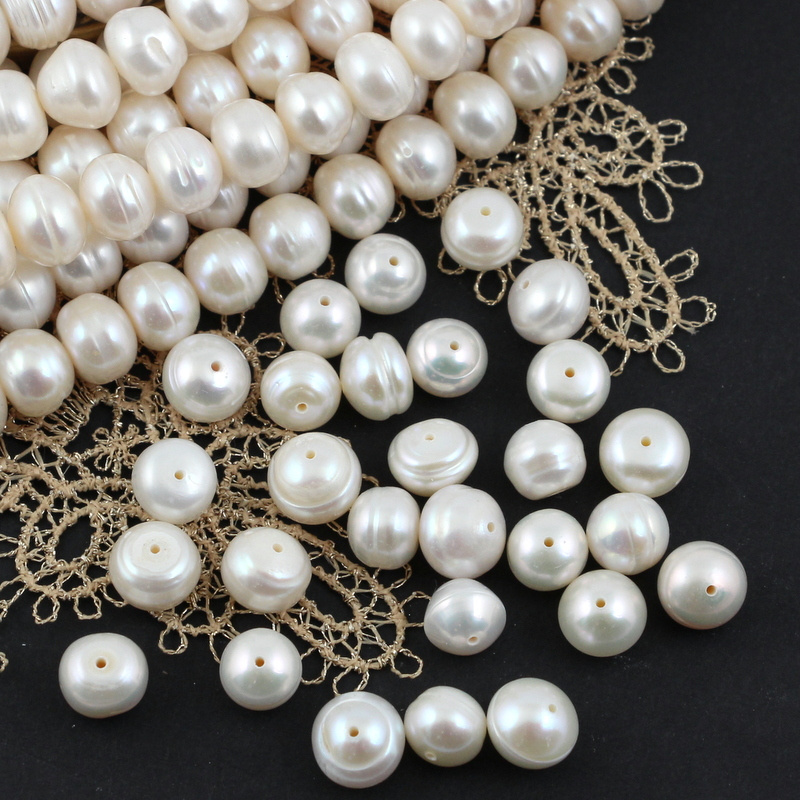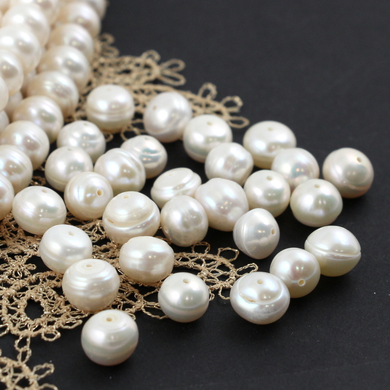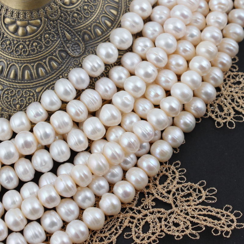Perły słodkowodne w kształcie nieregularnych oponek. Kolorystyka biel/ecru.