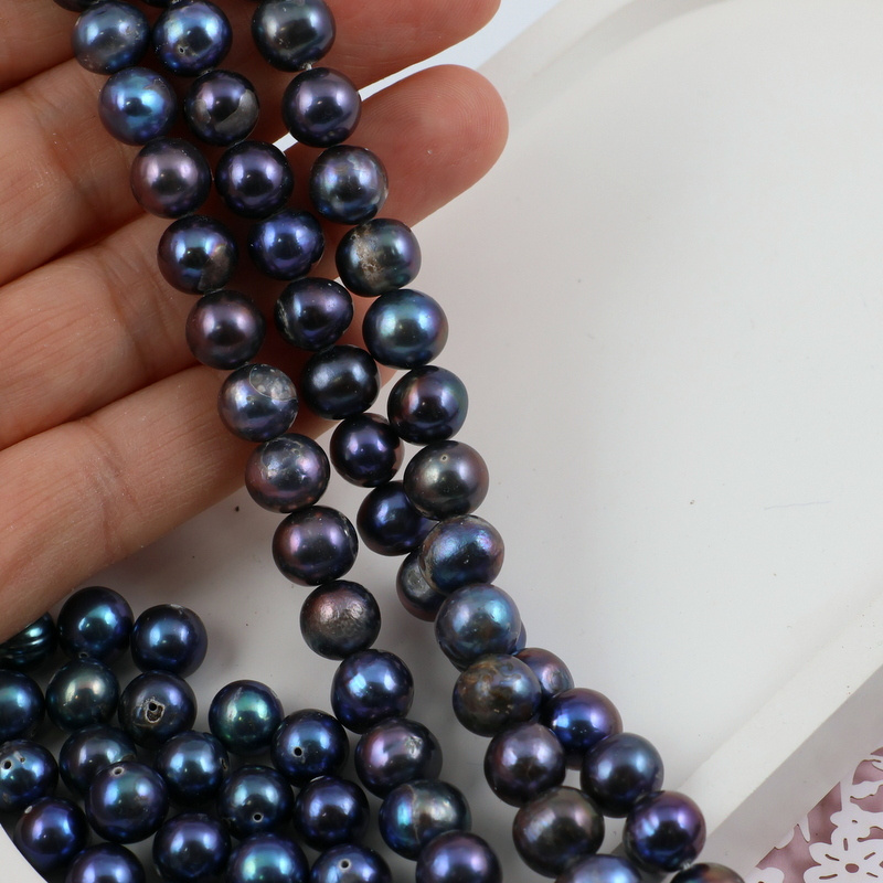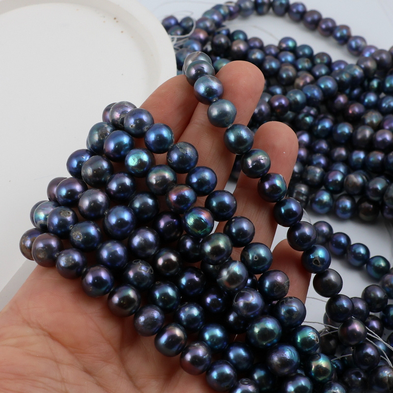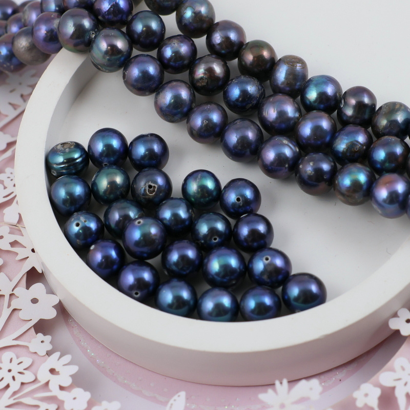 Fioletowo-zielone (tzw. czarne perły) w kształcie lekko nieregularnych kul i zróżnicowanej powierzchni.
