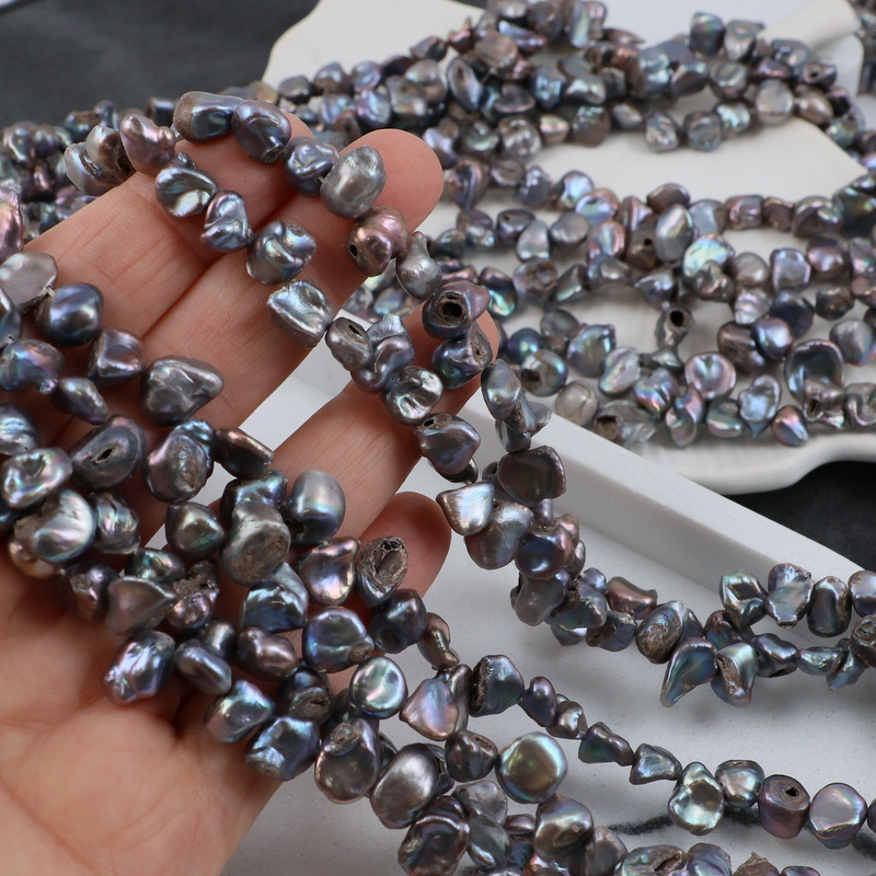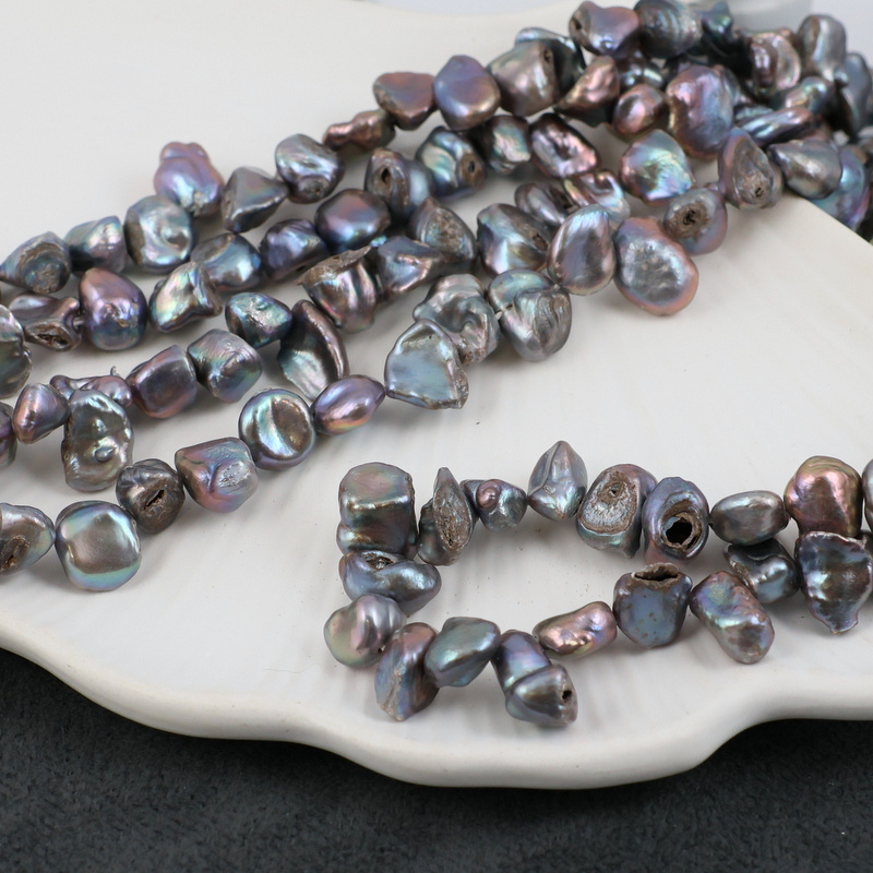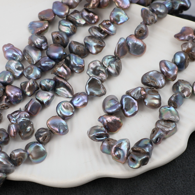 Perły słodkowodne w kolorze fioletowo-szarym, opalizujące.