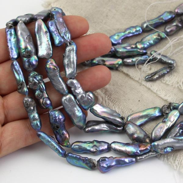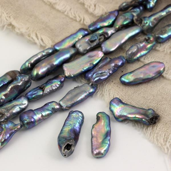 OpisPodłużne pałeczki perły słodkowodnej biwa w kolorze tęczowo-fioletowym (kolor pawi).