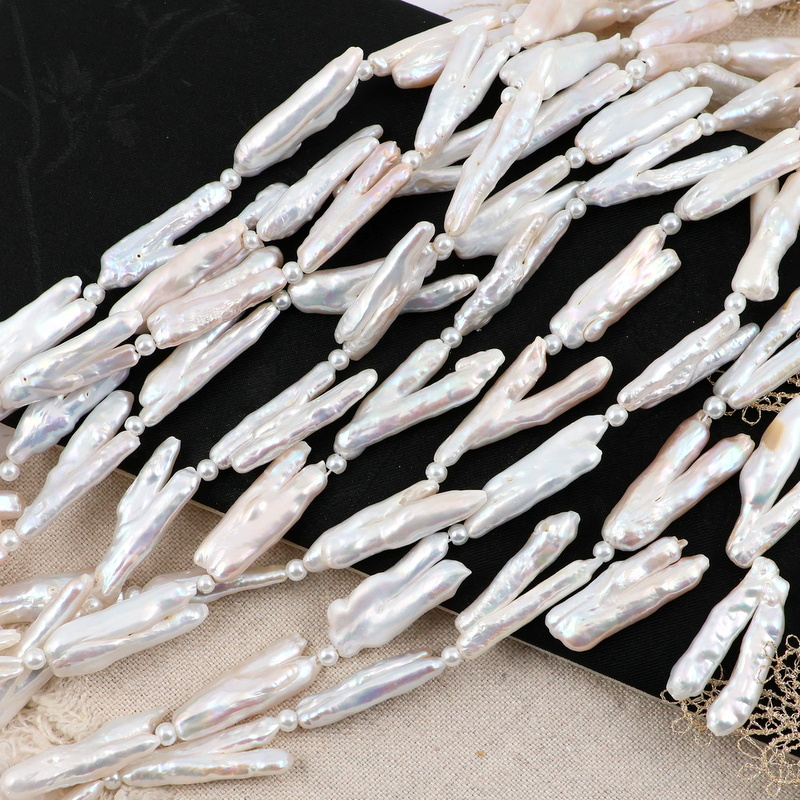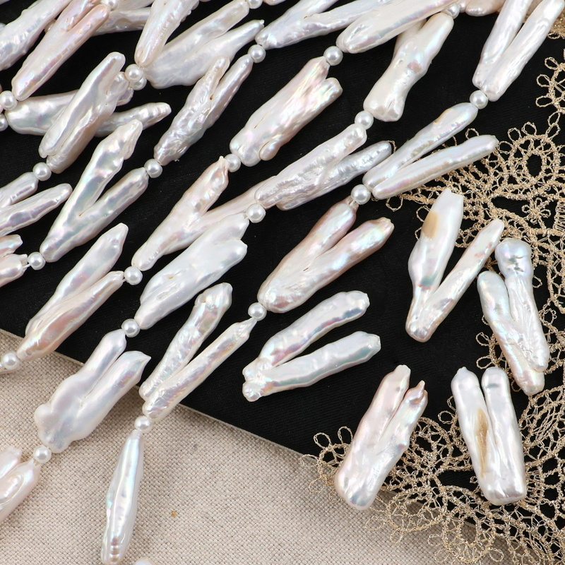 Nieregularne okazy perły słodkowodnej w kształcie gałązki. Kolor biały, kremowy z metaliczną poświatą.