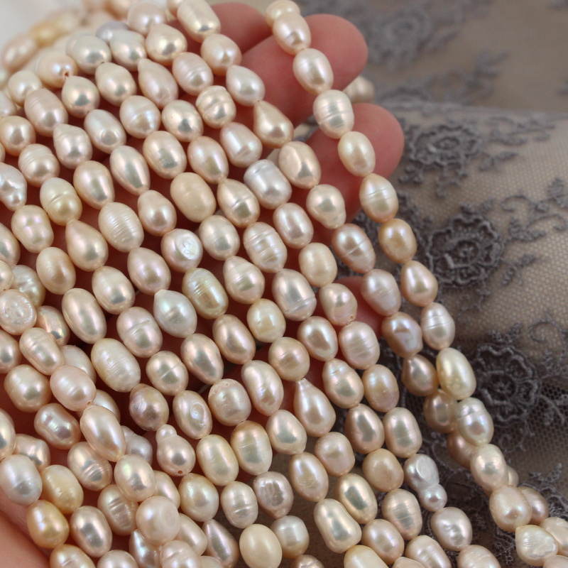 Sznur pereł słodkowodnych, perełki w kształcie oliwek, większość z ładnym połyskiem, ale są też matowe i ze zmarszczeniami i bruzdkami.
