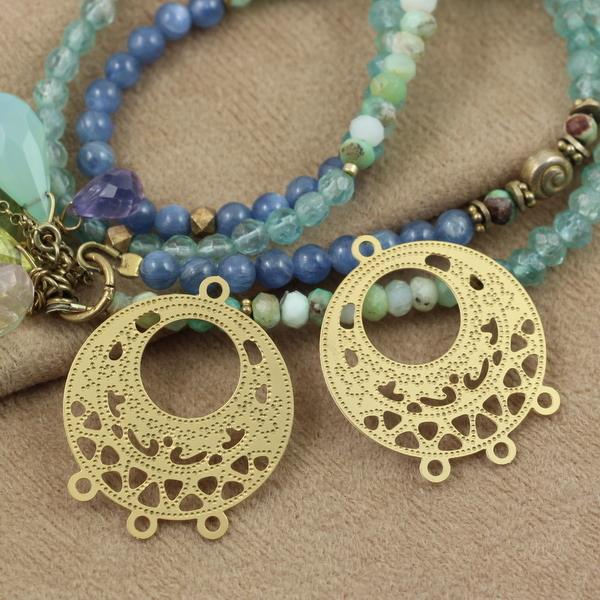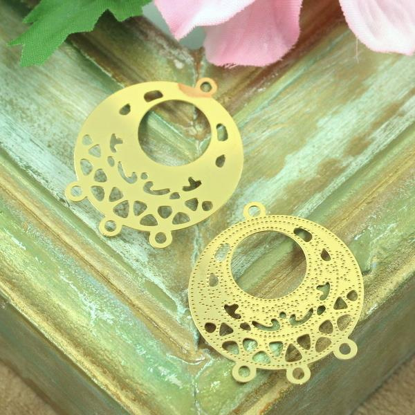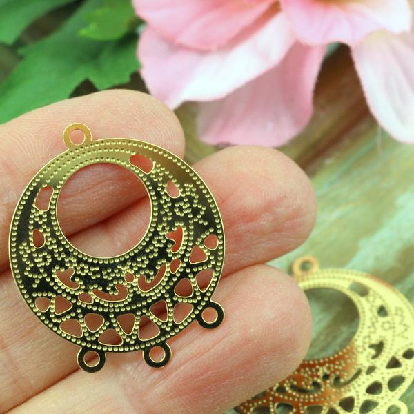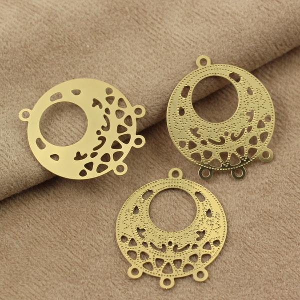 Element w kształcie koła z trzema otworami z dołu do montażu dodatkowych ozdób - kropli, kamieni lub gotowych elementów z sutaszu czy beadingu.