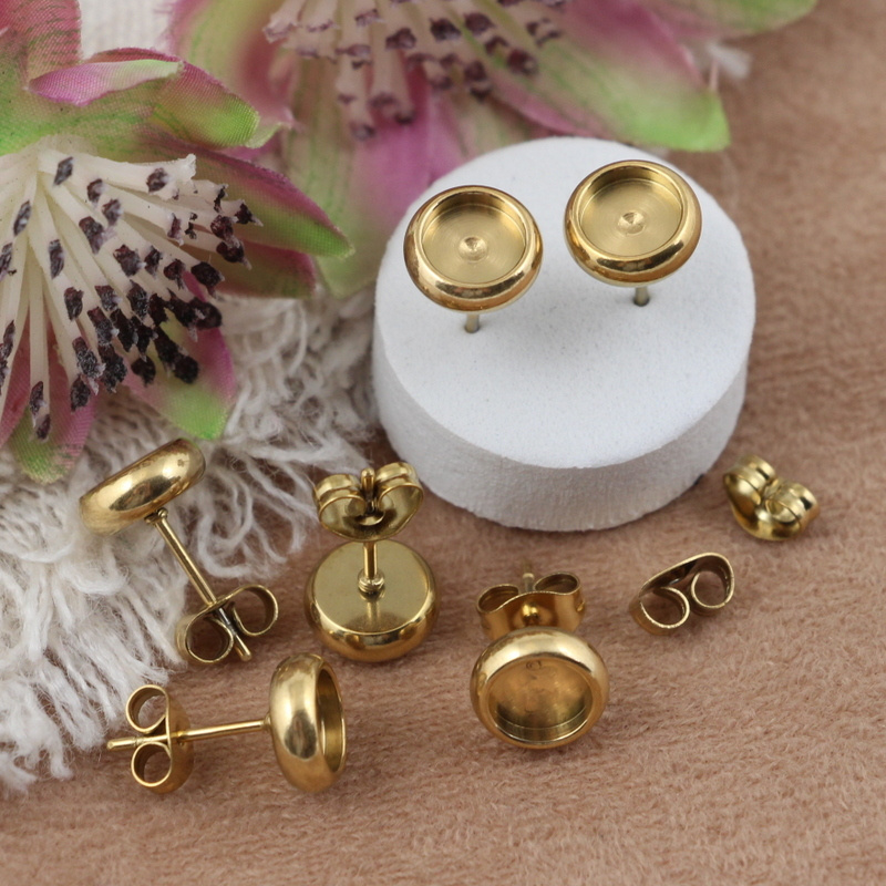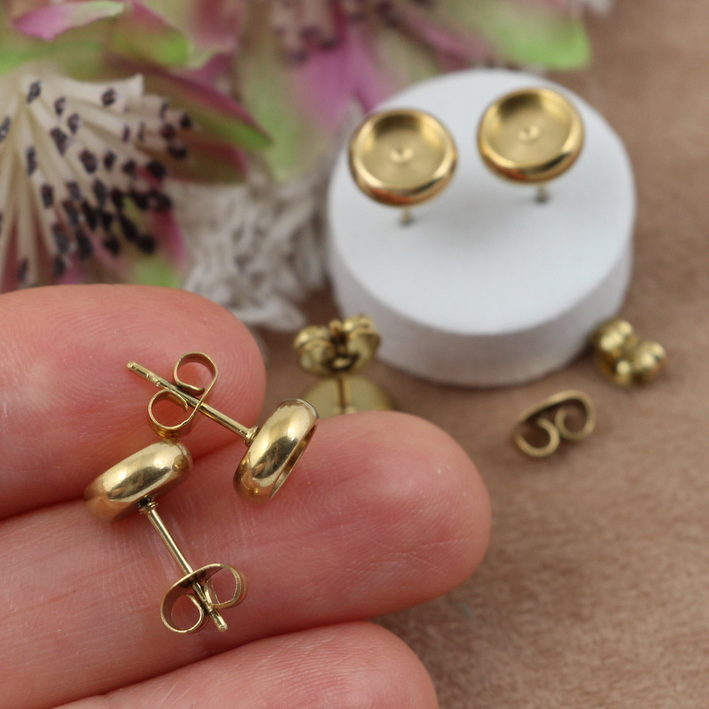 Bigle sztyfty z rantem do wklejania małych kaboszonów, pereł czy koralików etc. W komplecie z zatyczkami - barankami. Stal szlachetna 304 pozłacana (IP)