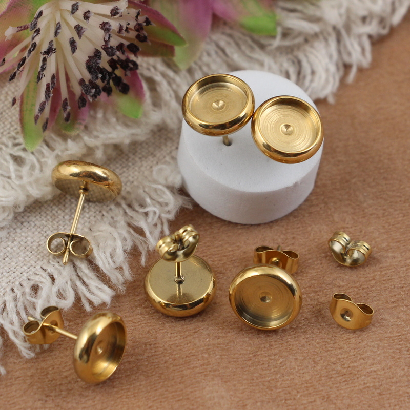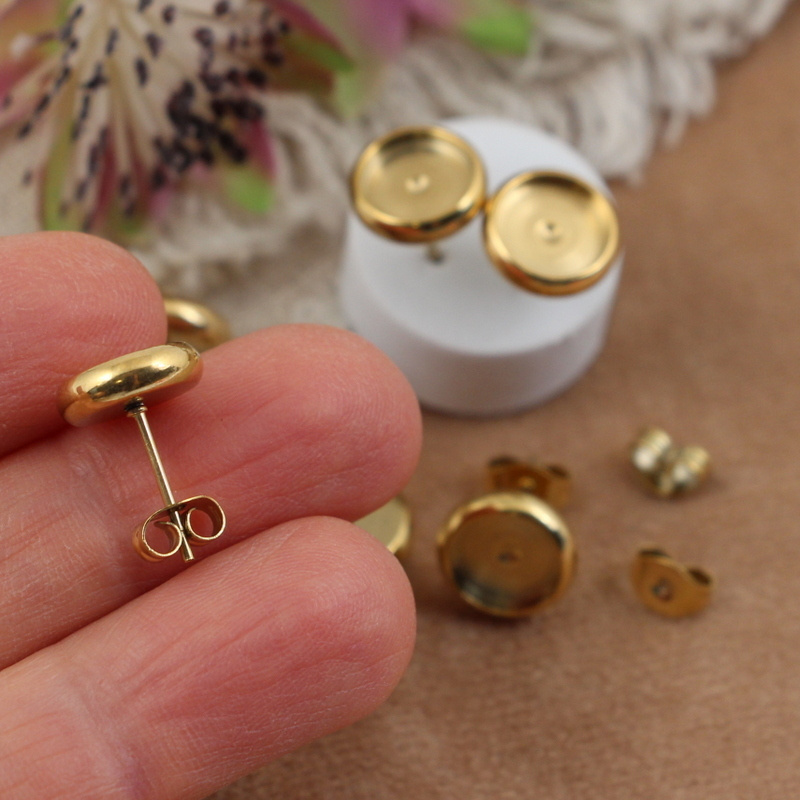 Bigle sztyfty z rantem do wklejania małych kaboszonów, pereł czy koralików etc. W komplecie z zatyczkami - barankami. Stal szlachetna 304 pozłacana (IP)